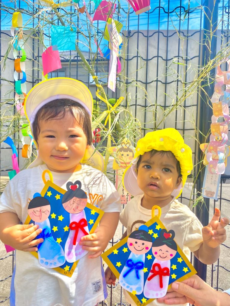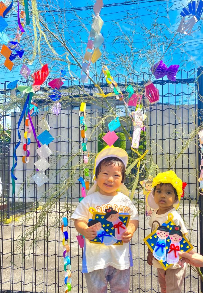 外に飾って足型で作った七夕製作を持って記念撮影📸